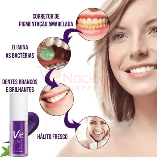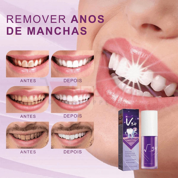 O Clareador Dental V34 utiliza tecnologia de correção de cor, ajudando a equilibrar visualmente os tons dos dentes. Basta aplicar conforme o uso indicado para notar uma aparência mais clara e um sorriso mais harmônico.
